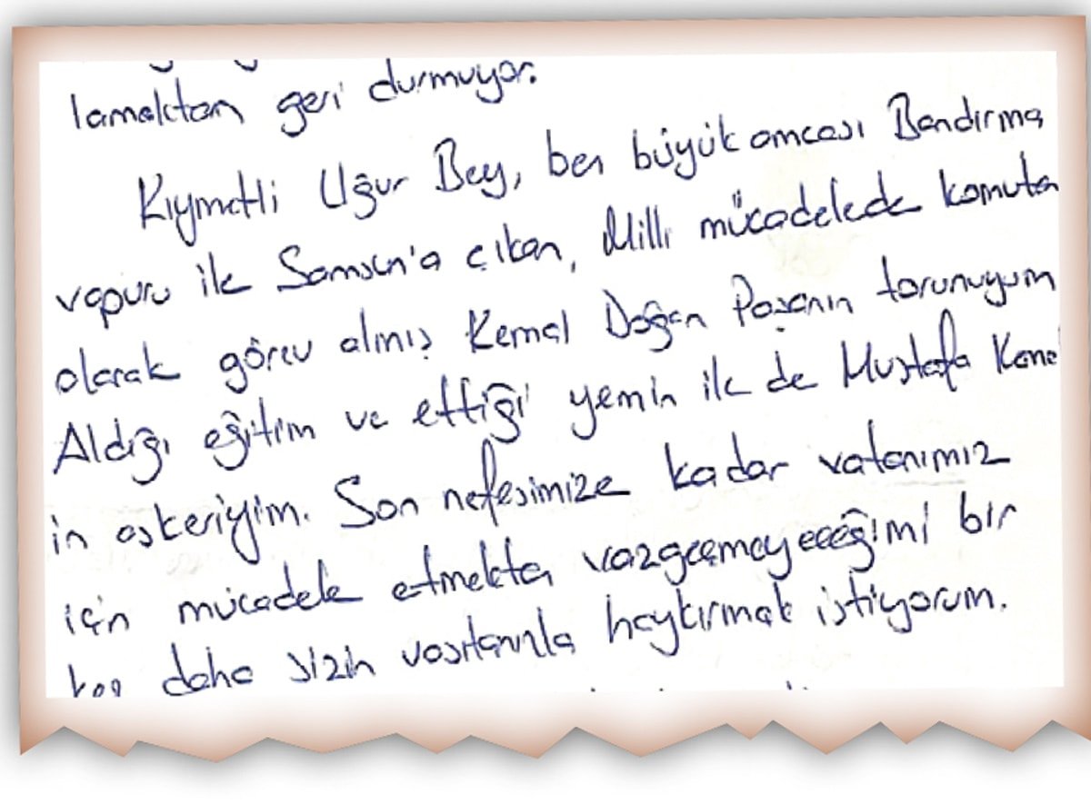 Ben büyük amcası Bandırma Vapuru ile Samsun’a çıkan, Milli Mücadele’de komutan olarak görev almış Kemal Doğan Paşa’nın torunuyum. Aldığım eğitim ve ettiğim yemin ile de Mustafa Kemal’in askeriyim. Son nefesime kadar vatanımız için mücadele etmekten vazgeçmeyeceğimi bir kez daha sizin vasıtanızla haykırmak istiyorum.